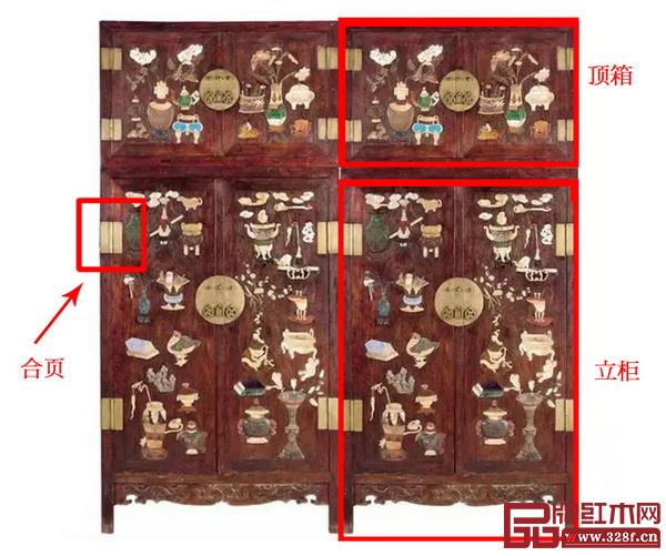 由于柜子一般成對組合,所以每對柜子立柜、頂箱各兩件,共計四件,叫“四件柜”。